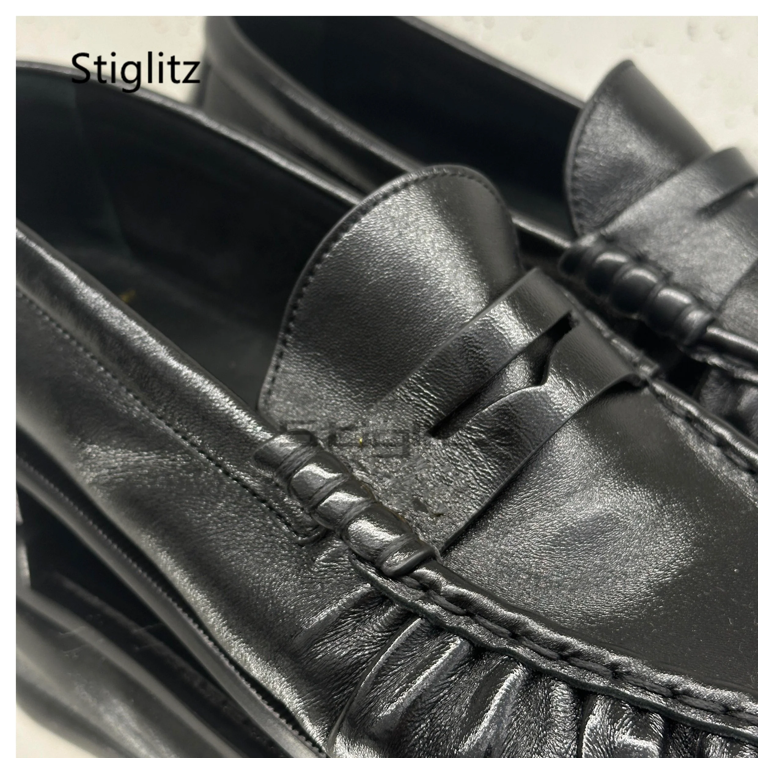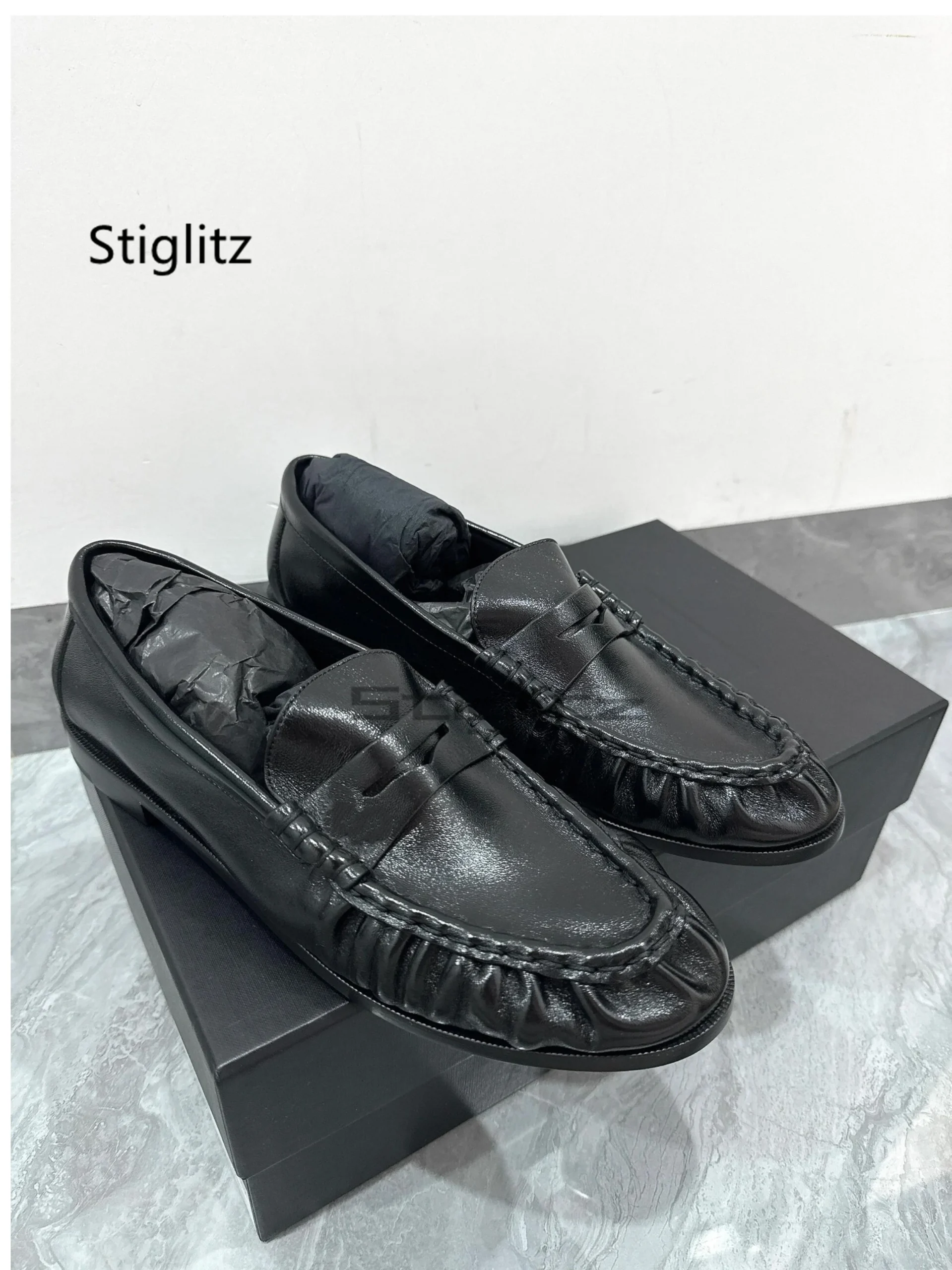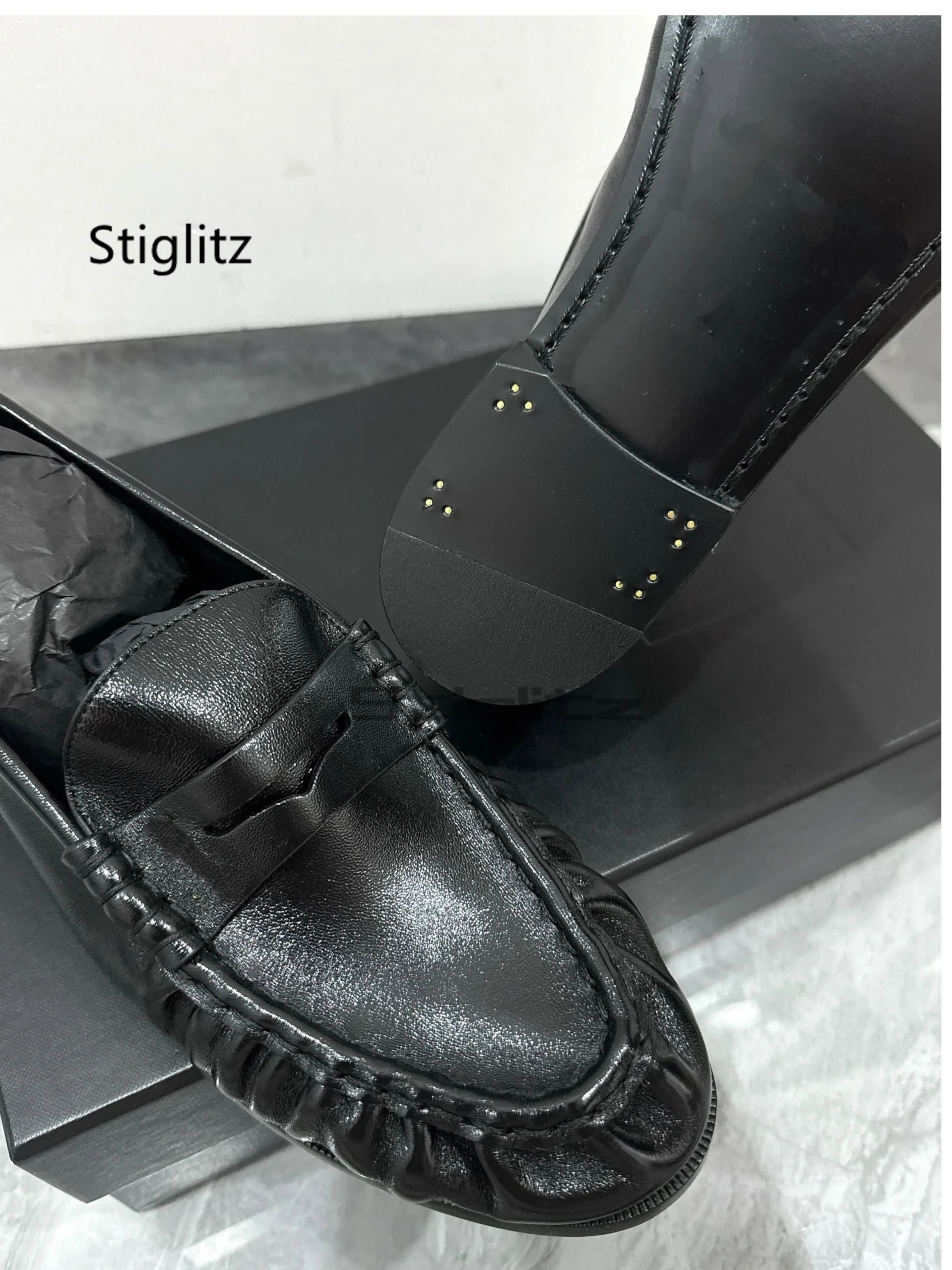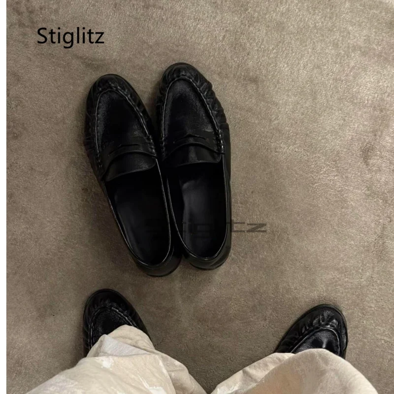 Black Retro Pleated Loafers for Men and Women Slip On Lazy Shoes Pointed-Toe Casual Soft Leather Shoes Comfortable Couple Shoes