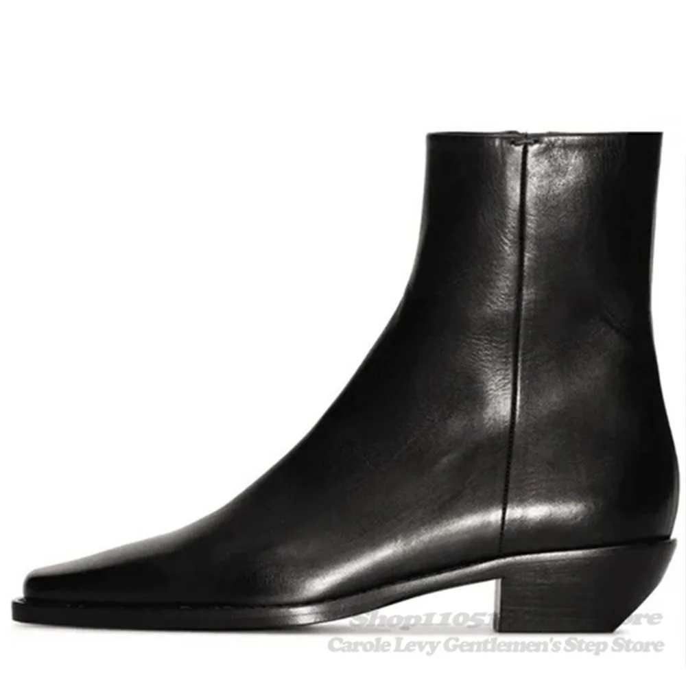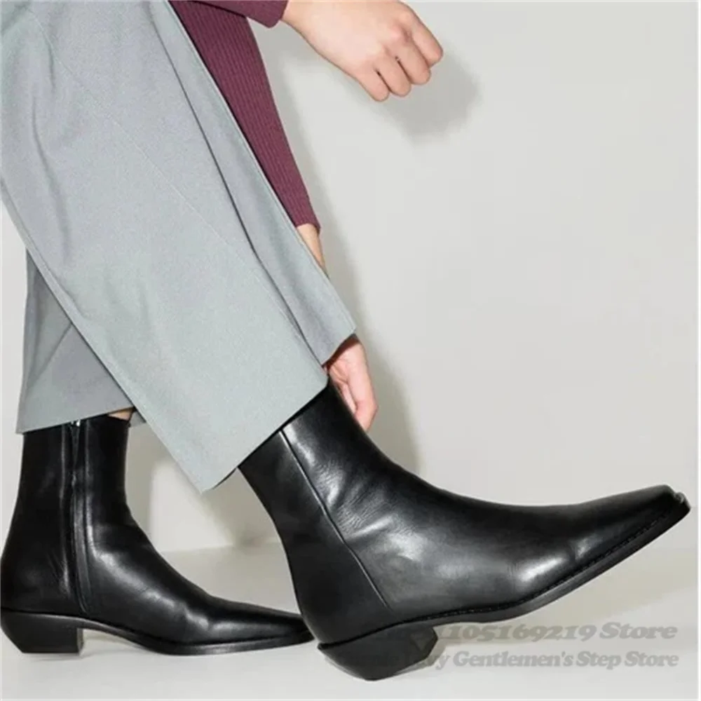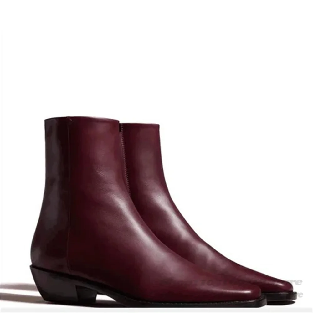 Wine Red Genuine Leather Mens Ankle Boot Pointed Toe Side Zipper Low Heel Handmade Solid Color Chelsea Boots Male Shoes